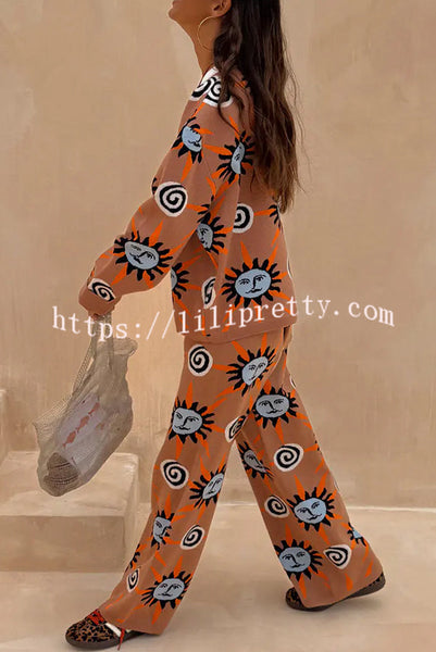 Mediterranean Art Knit Unique Sun Vortex Print Long Sleeve Relaxed Sweater