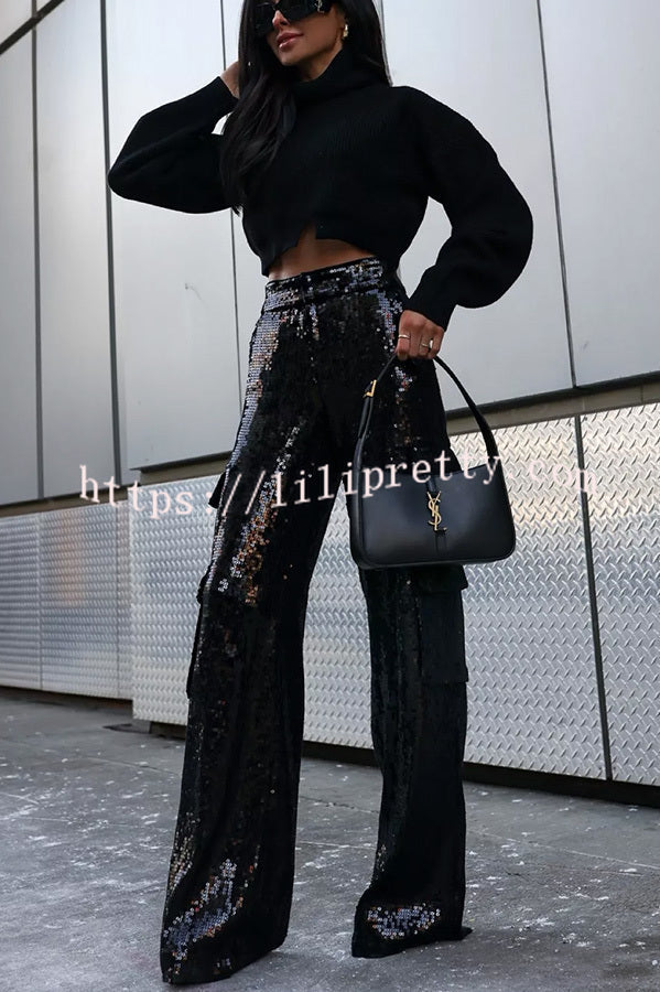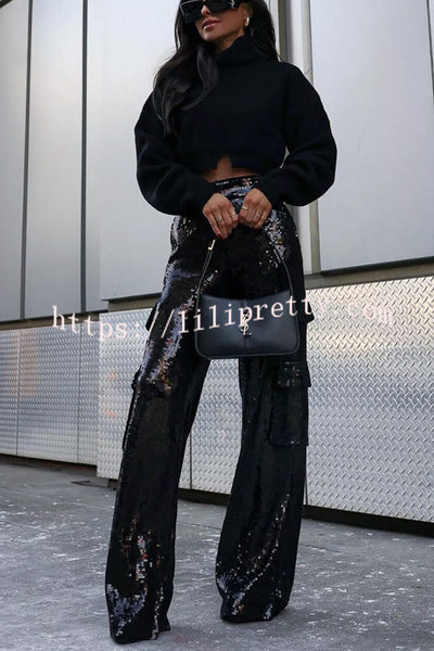 Night Gathering Sequin High Rise Pocketed Wide Leg Cargo Pants