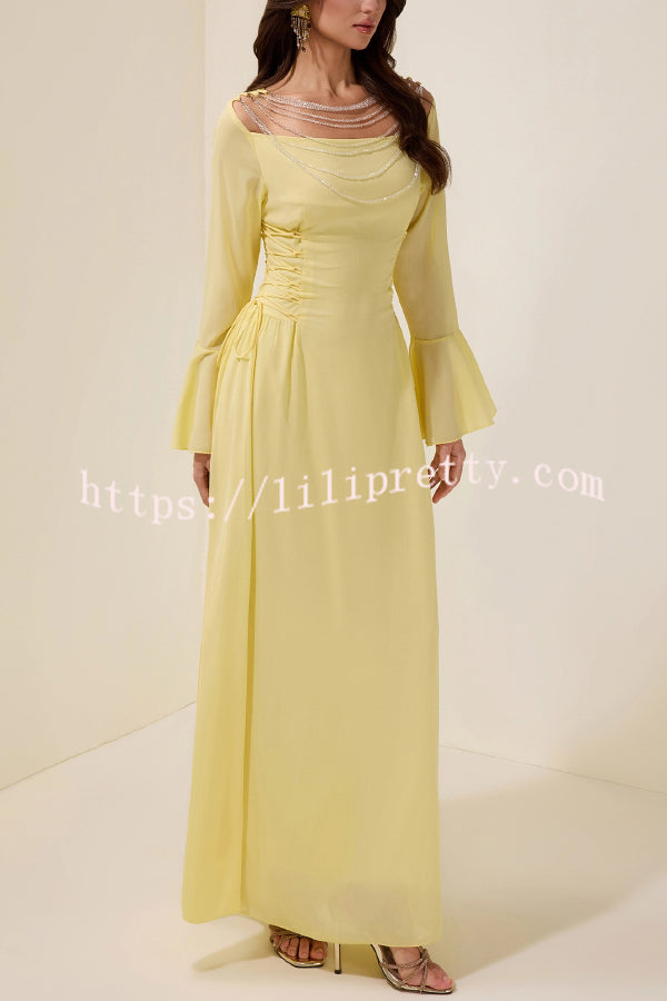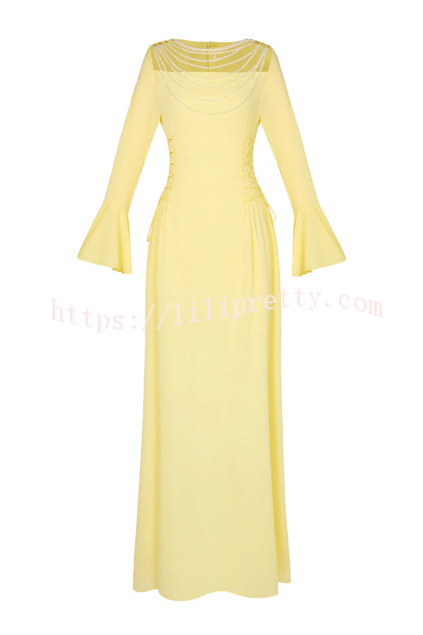 Fashionable Beaded Long-sleeved Square-neck Fitted Waist Tie Maxi Dress