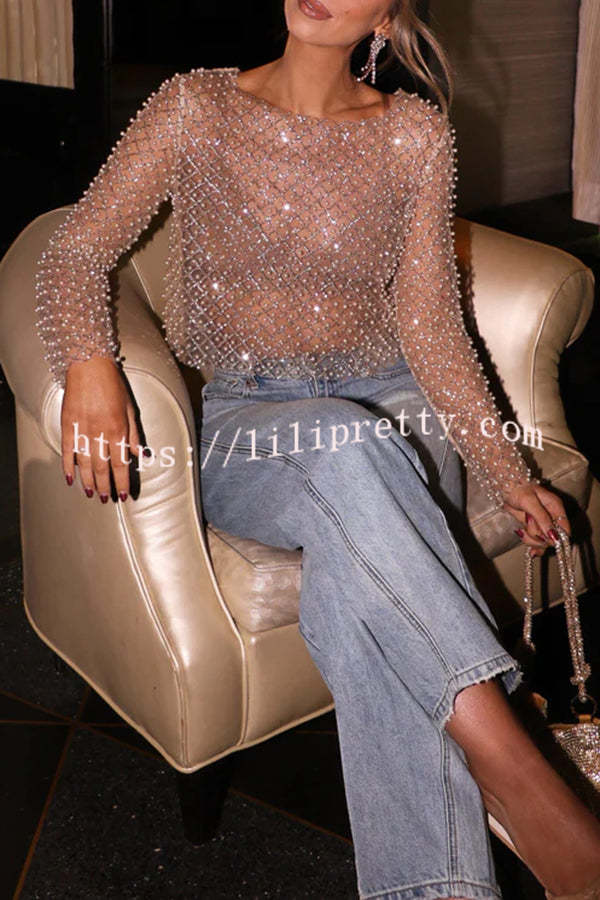 Champagne Kiss Sparkling Pearls Long Sleeve Loose Sheer Top