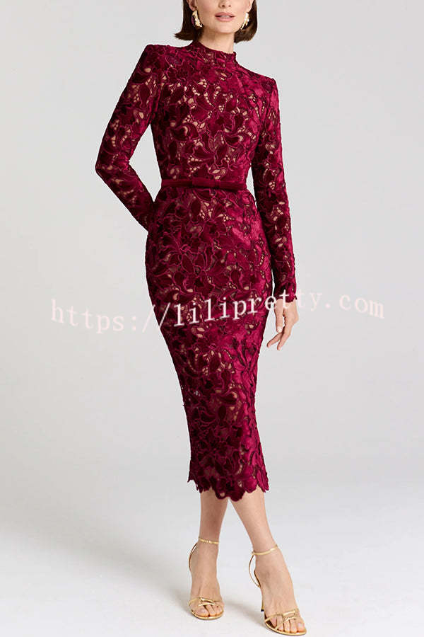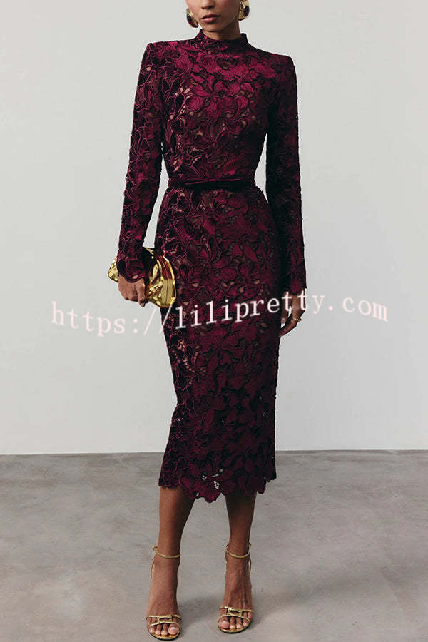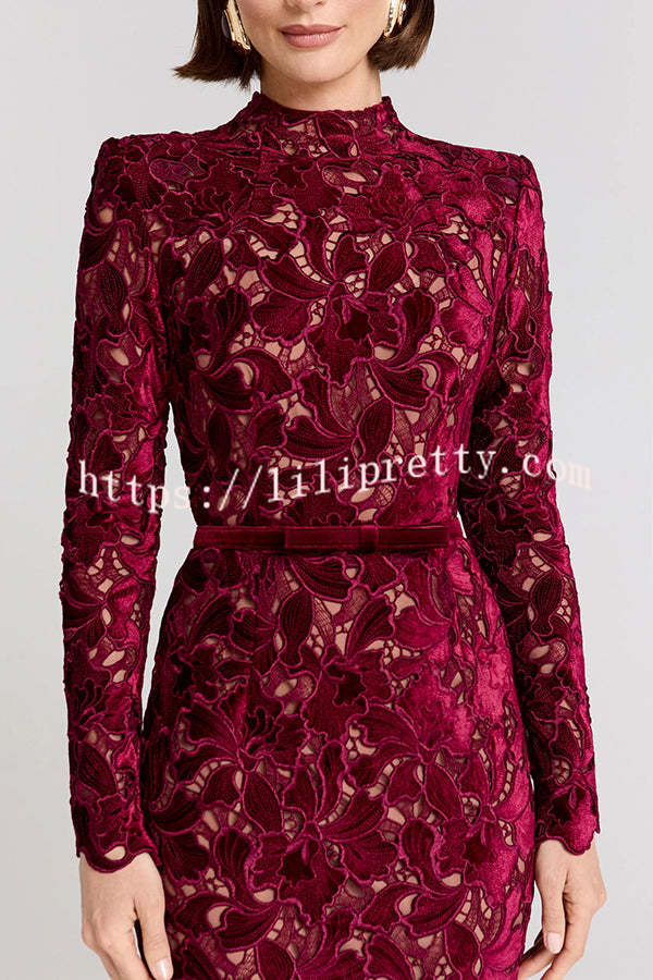 Diane Velvet Embroidered Floral Lace Long Sleeve Belt Scallop Edge Midi Dress