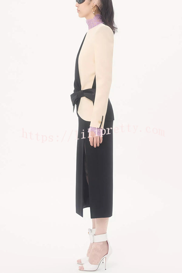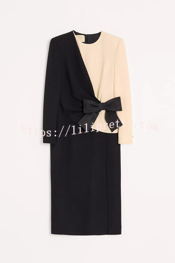 Love Unfolded Contrast Color Side Bow Tie-up Long Sleeve Slit Midi Dress