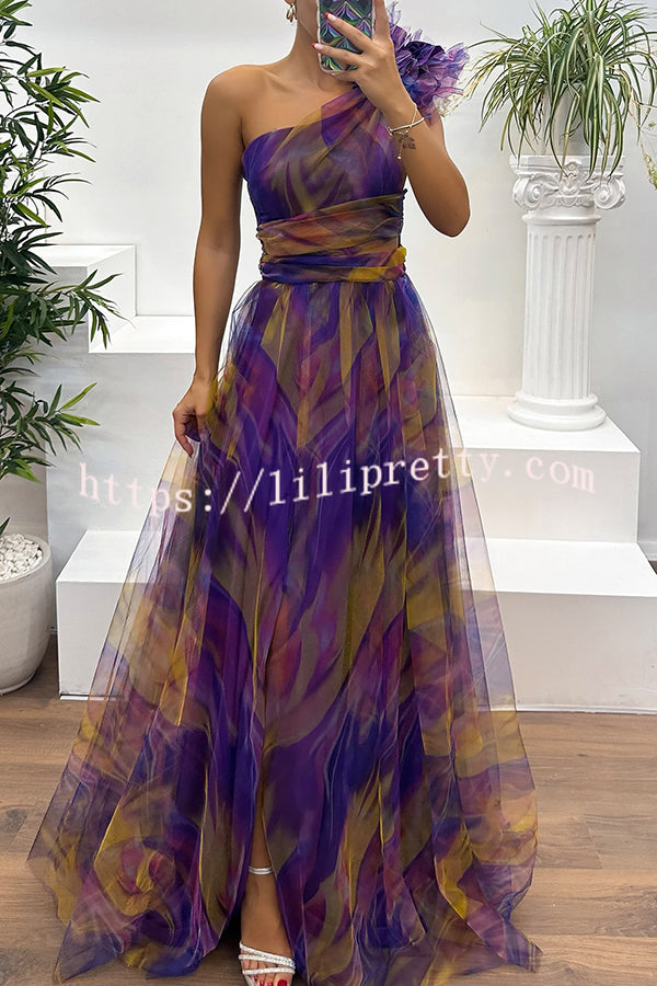 Charming Embrace Tulle Floral Pleated One Shoulder Slit Maxi Dress