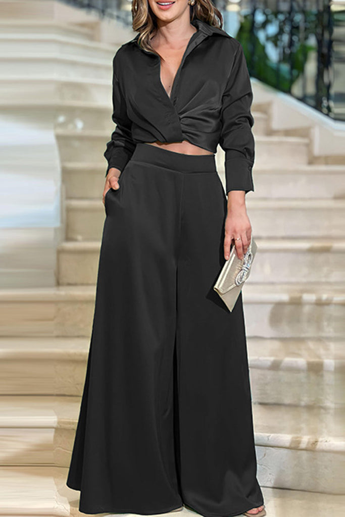 Elegant Solid Fold Turndown Collar Long Sleeve Two Pieces