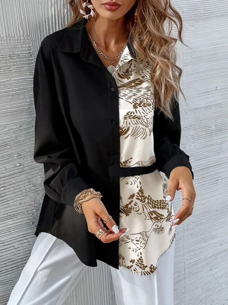 Leisure Buttoned Floral Printed Color-Block Lapel Collar Blouses&Shirts Tops