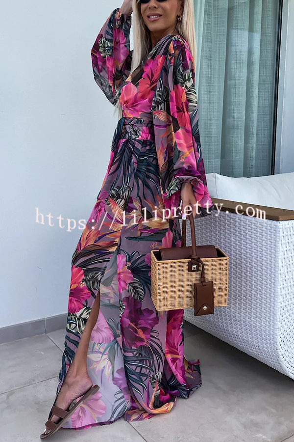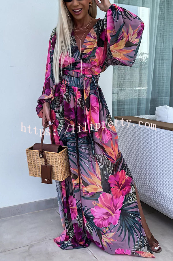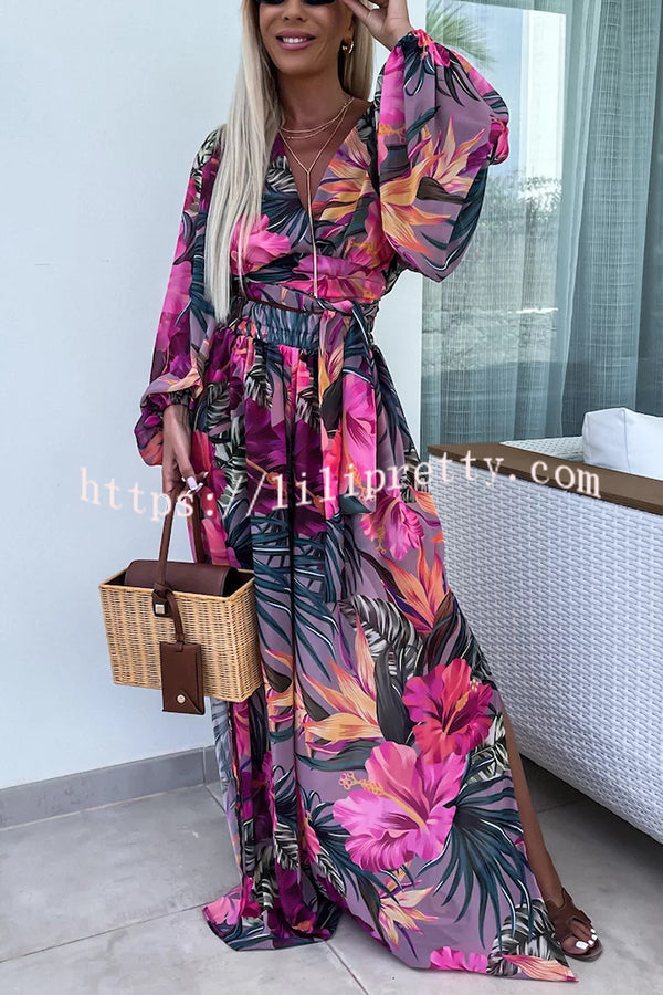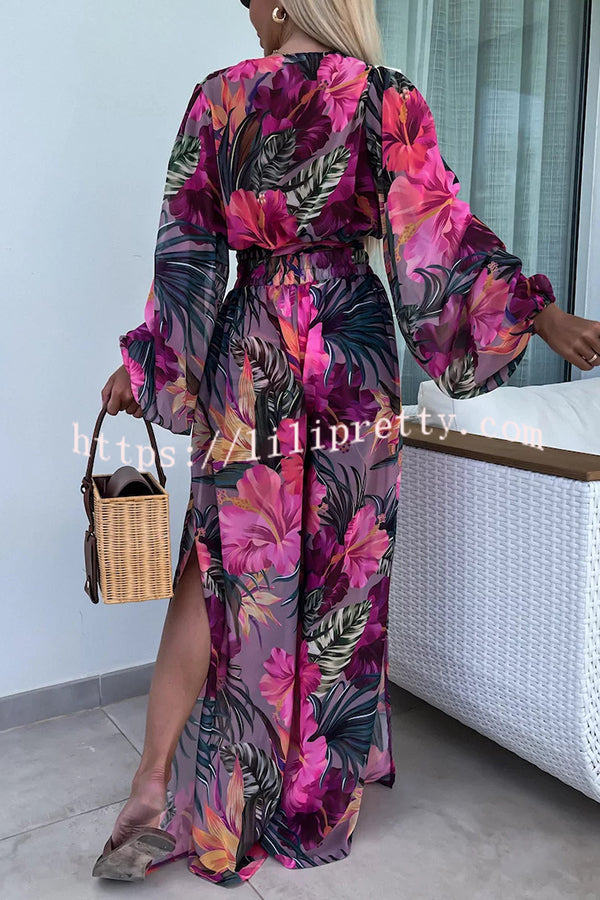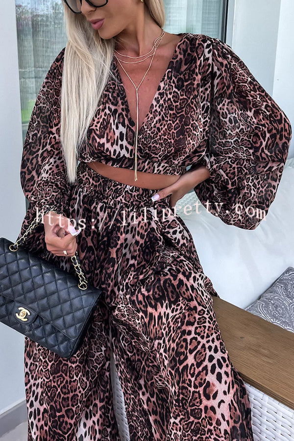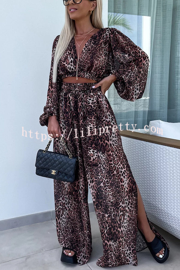 Lady Summer Leopard Print Lantern Sleeve Top and Elastic Waist Slit Pants Set