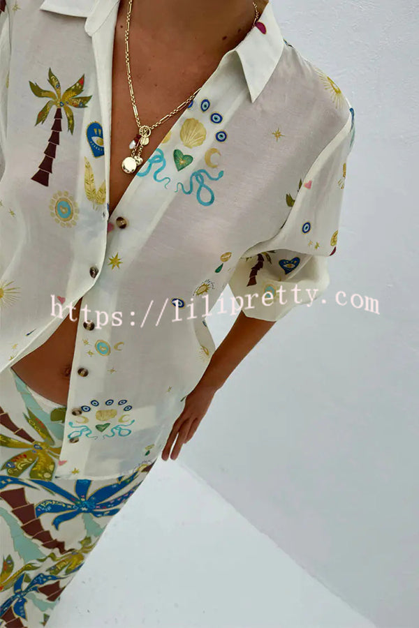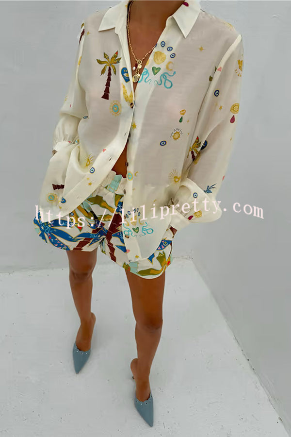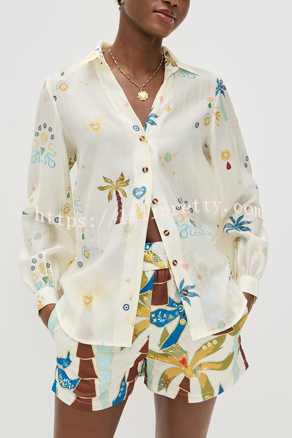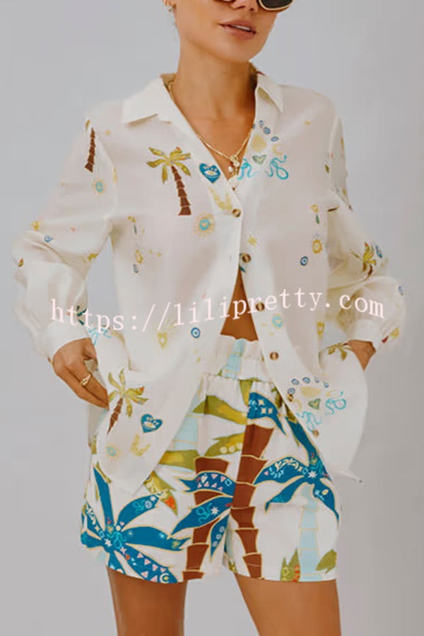 Linen Blend Resort Coconut Palm Print Long Sleeve Lapel Shirt and Elastic Waist Casual Pocket Shorts Set
